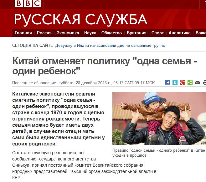 Сообщает BBC. Цитата: Китайские законодатели решили смягчить политику “одна семья – один ребенок”, проводившуюся в стране с конца 1970-х годов с целью ограничения рождаемости. Теперь семьям можно будет иметь двух детей, в случае если отец и мать сами были единственными детьми у своих родителей.