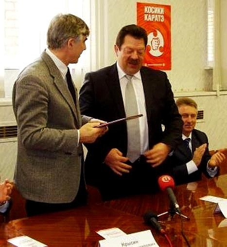 От имени председателя МГД В.П.Платонова депутат МГД В.П.Иванов наградил президента Федерации Косики каратэ России М.В.Крысина Почетной грамотой Городского собрания Москвы в связи с 20-летним юбилеем ФККР.