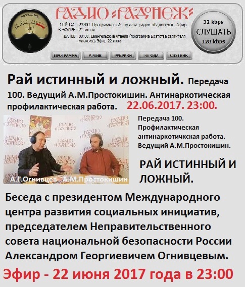 Пресс-служба Международного центра развития социальных инициатив и Неправительственного совета национальной безопасности России информирует, что 22 июня 2017 года на Всемирном Православном Радио Радонеж пройдет эфир (передача 100) программы Рай истинный и ложный с участием председателя НСНБР А.Г.Огнивцева. Ведущий – А.М.Простокишин.