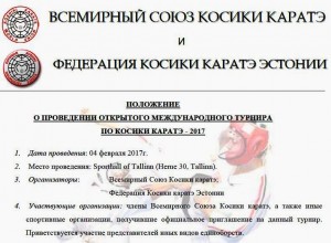 В Таллинне (Эстония) стартовал Открытый международный турнир по Косики каратэ – EURO KOSHIKI KARATE 2017. В турнире участвует сборная России по Косики каратэ под руководством главного тренера Ханси М.В.Крысина. Вместе с россиянами главный приз турнира оспаривают спортсмены Эстонии, Латвии, Литвы, Финляндии и других стран.