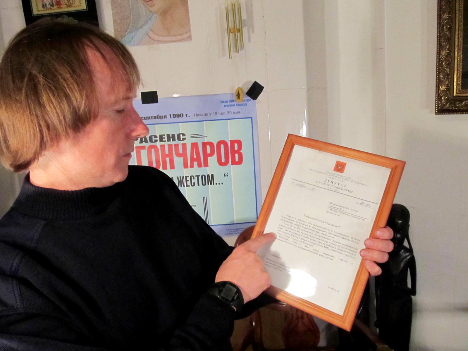 На фото российский психолог, руководитель Московской школы гипноза, победитель Всемирного конкурса феноменов (Япония, 1992), Гран-при, Токио 1992 – лучший экстрасенс мира, Геннадий Гончаров с благодарственным письмом за подписью депутата Государственной Думы А.Н.Волкова “За помощь военнослужащим”.